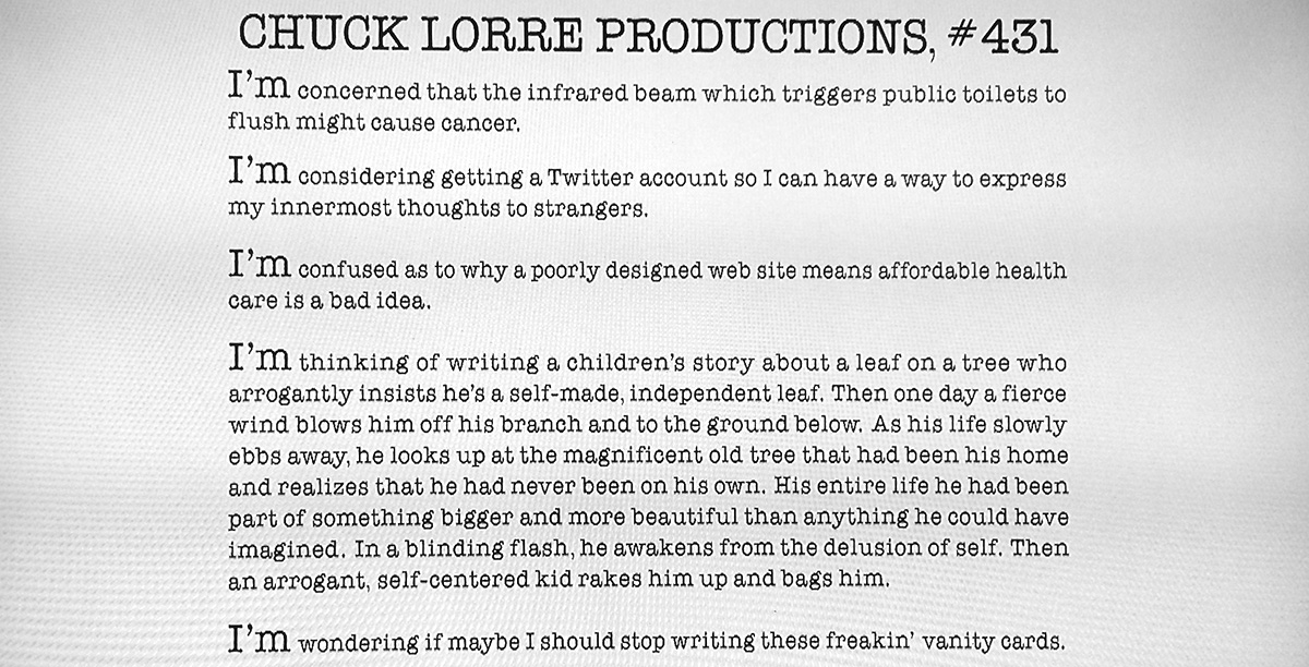 At the end of tonight's Big Bang Theory episode, I read yet another Chuck Lorre vanity card. Normally they're funny and sometimes insightful. But lately they've begun to tackle political issues, so I thought it might be interesting to write some responses to a few of them. So let's do it. First up—#431.